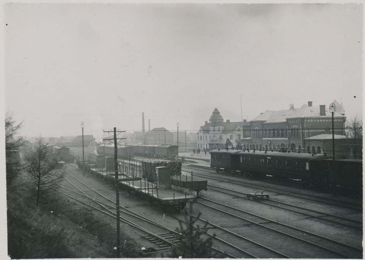 Värnamo station med bangård.Halmstad-Nässjö Järnväg, HNJ. Första stationshuset byggdes 1877 och revs 1995. för att det stod i vägen för en planerad vägkorsning. Första lokstallet byggdes 1875 men revs 1894 och ett nytt byggdes på annan plats på bangården. Ett nytt stationshus byggdes 1899 av Skånes-Smålands Järnväg, SSJ men byggnaden användes aldrig som järnvägsstation då SSj och HNJ enades om att använda HNJ station. 1902 byggdes ett nytt gemensamt stationshus vid godsmagasinet. 1903 anslöts Borås- Alvesta, BAJ hit och då byggdes ett nytt godsmagasin som bekostades av BAJ. Detta magasin tillbyggdes 1918 och 1935. HNJs gamla stationshus flyttades 1902 och blev bostads- och överliggningshus.