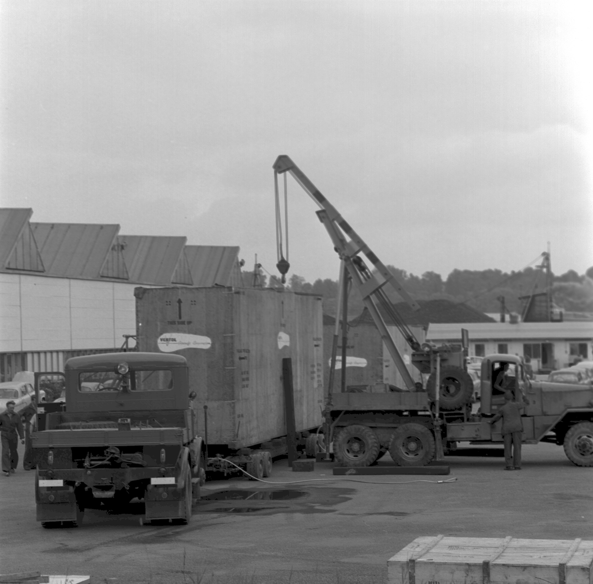 Lossning av helikopter i emballage från låglastande släpvagn, vagnbjörn