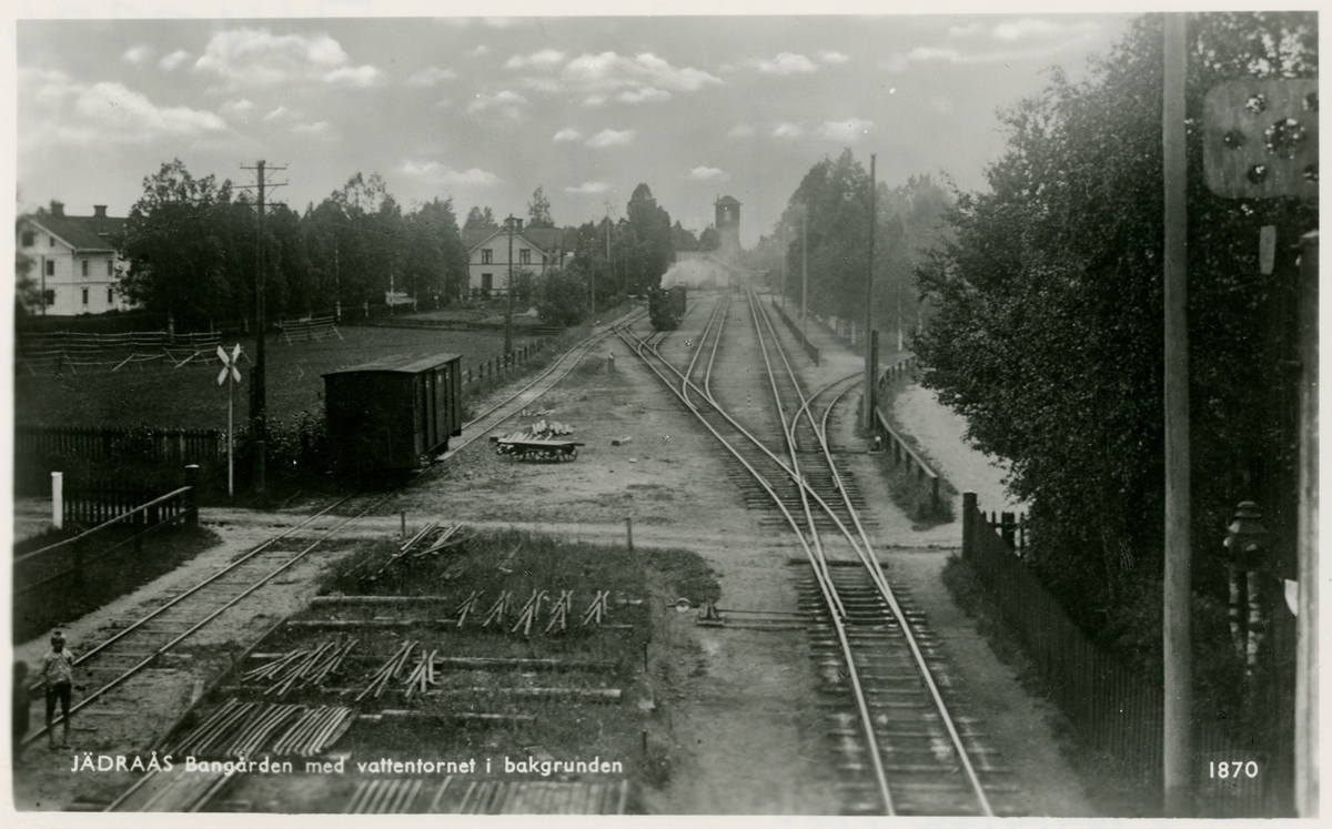 Dala - Ockelbo - Norrsundets Järnväg, DONJ Jädraås bangård med stationhus och vattentorn. Reproduktion efter vykort.