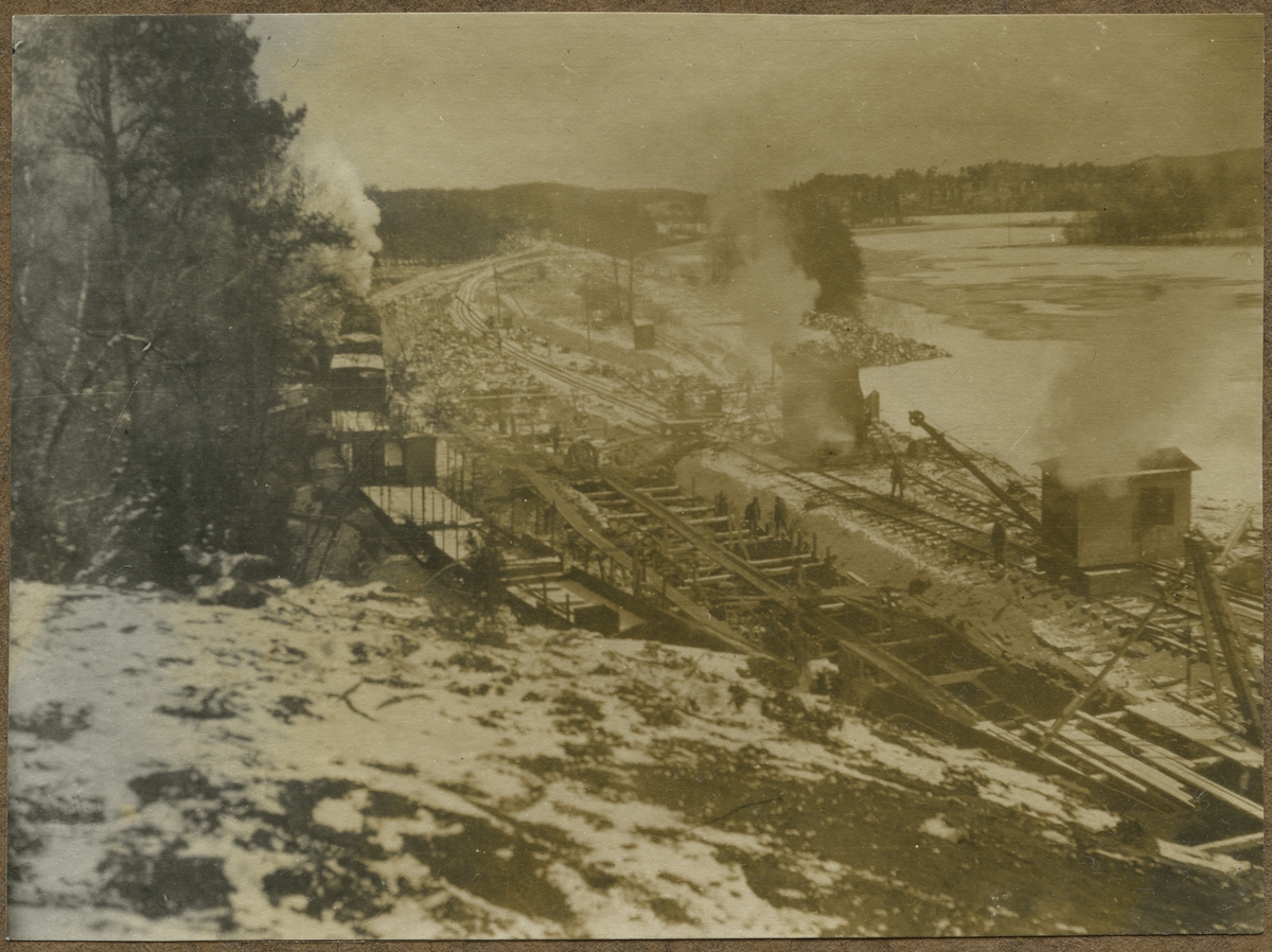 Dubbelspårsbyggnaden mellan Alingsås - Olskroken. Provisorisk förbigångsspår under uppförande avgrundmure för dubbelspår vid Kobergsraset.