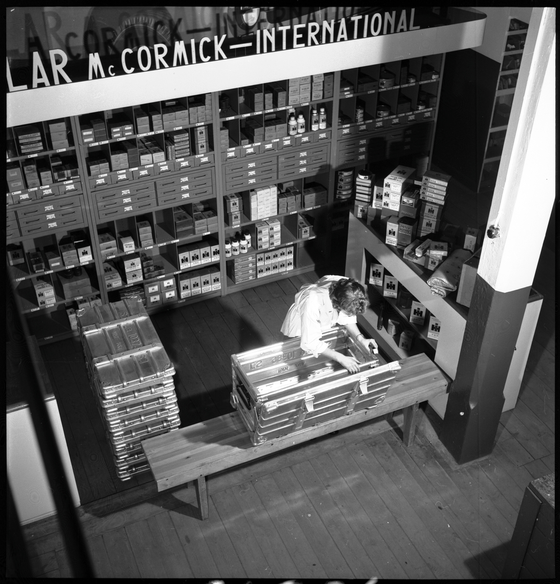 Kvinna instruerar hur man monterar småbehållare SJ La 10386, hopfällbar box av plåt. Text i bakgrunden : Mc Cormick - International
