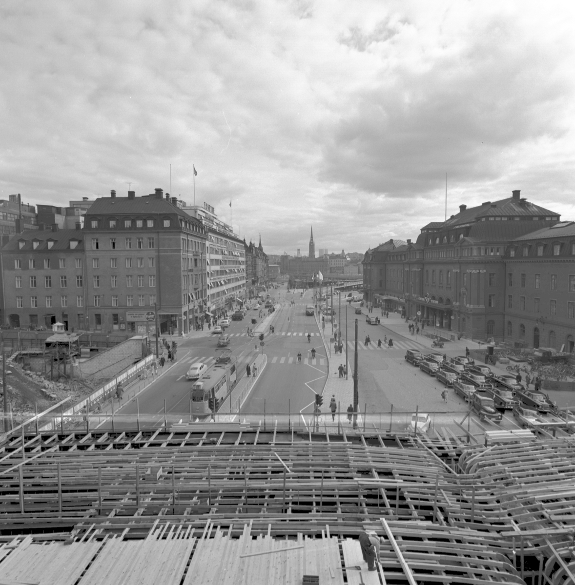 Centralplan, Stockholms central till vänster i bild. Bygge av Klarabergsviadukten.