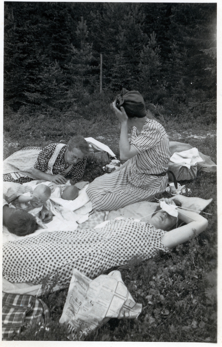 Sommaren 1944. Tekla och Långsjö-Pelle vid Johansfallet med döttrarna Siri och Ingeborg samt barnbarnen Lillemor och Astrid.