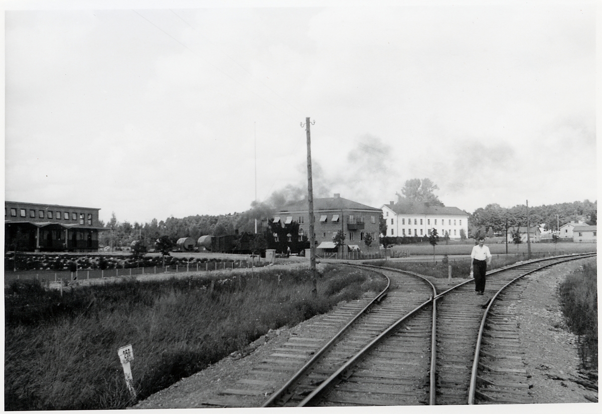 Sidospåret till vänster, c:a km 1,6 från Enköping, ledde till mjölkcentralen, syns till vänster, och fram till 1946 även vidare till Enköpings mekaniska verkstad. Spåret till höger ledde till Enköping och bakom fotografen låg linjen till Enköpings hamn.