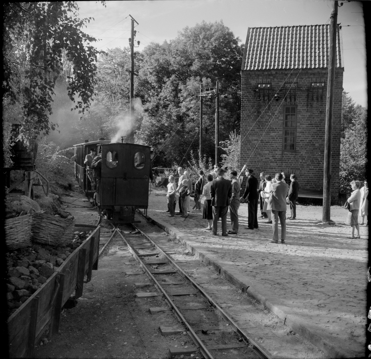 Resande till Östra Södermanlands Järnväg, ÖSlJ. ÖSlJ lok 2 "Lotta" och Kosta - Lessebo Järnväg, KLJ personvagn på hållplats vid transformator hus.