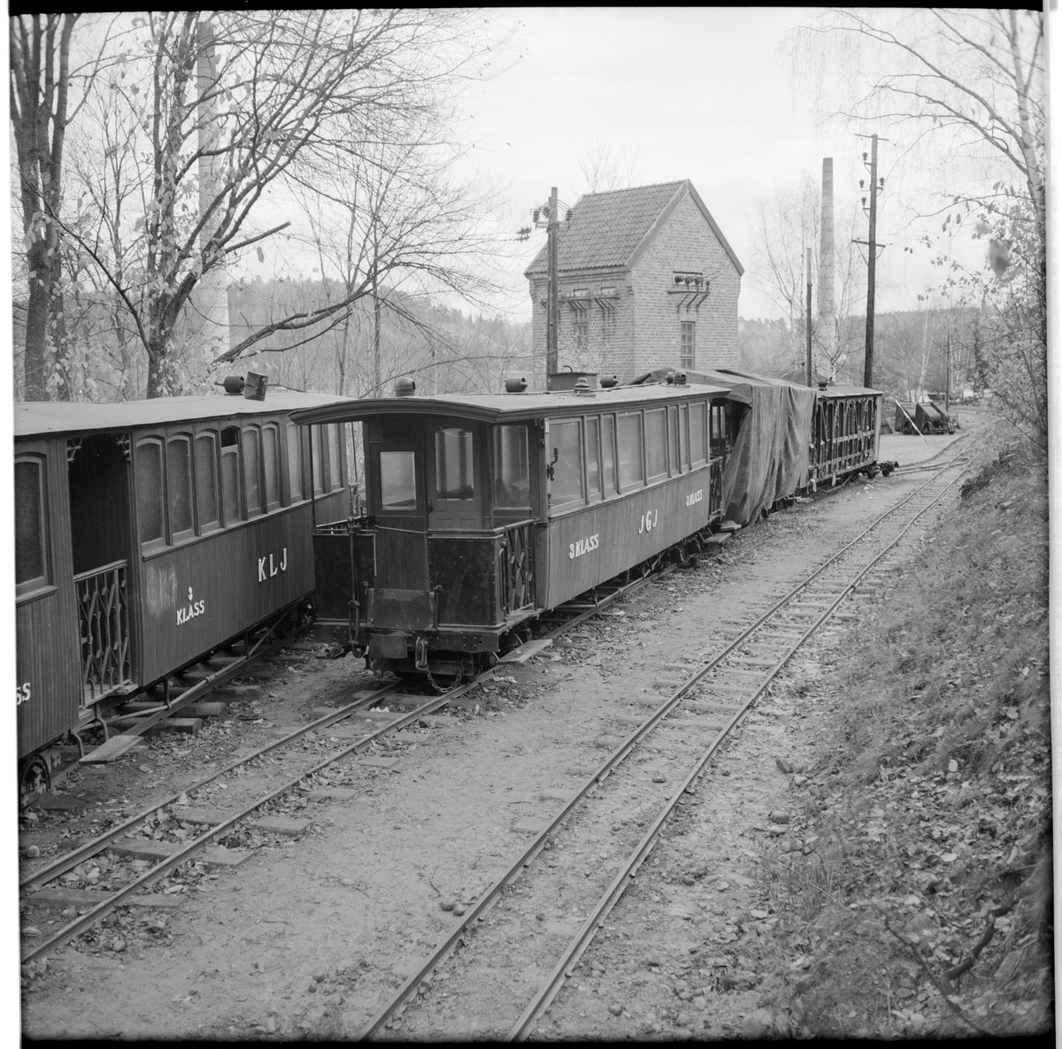 Museijärnväg Östra Södermanlands Järnväg, ÖSlJ. Personvagn Kosta - Lessebo Järnväg, KLJ och Jönköping - Gripenbergs Järnväg, JGJ. Vagnarna står på spåret vid Lina Tegelbruk. Transformatorhus ses bakom vagnarna.