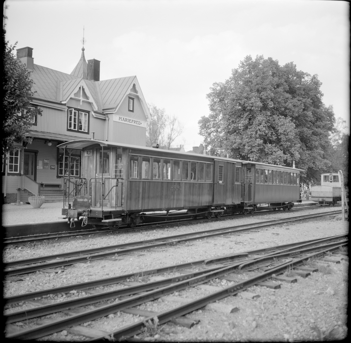 Museijärnvägen, Östra Södermanlands Järnväg, ÖSlJ personvagnar Helsingborg - Råå - Ramlösa Järnväg, HRRJ CFo 7 och Anneberg - Ormaryds Järnväg, AOJ personvagn och ackumulatorlok 18 på stationen i Mariefred.