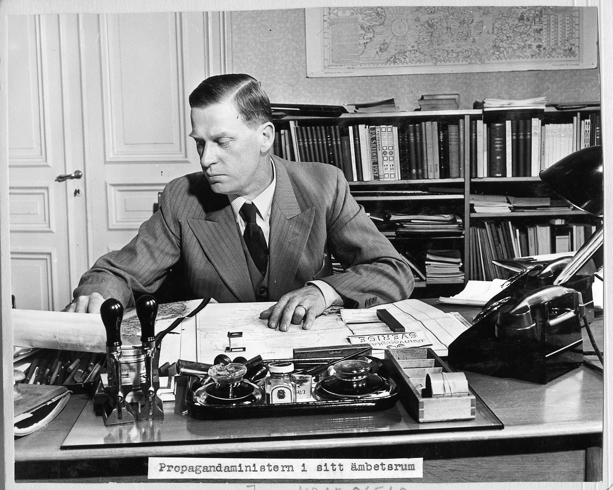Propagandaminister U. Bergstedt i sitt ämbetsrum.