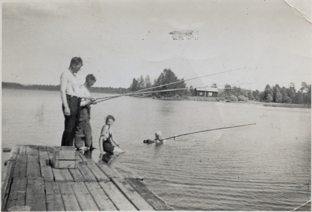 Titel: Långsjö-Pelle metar från bryggan. På norrsidan av sjön syns torpet Engvalls.