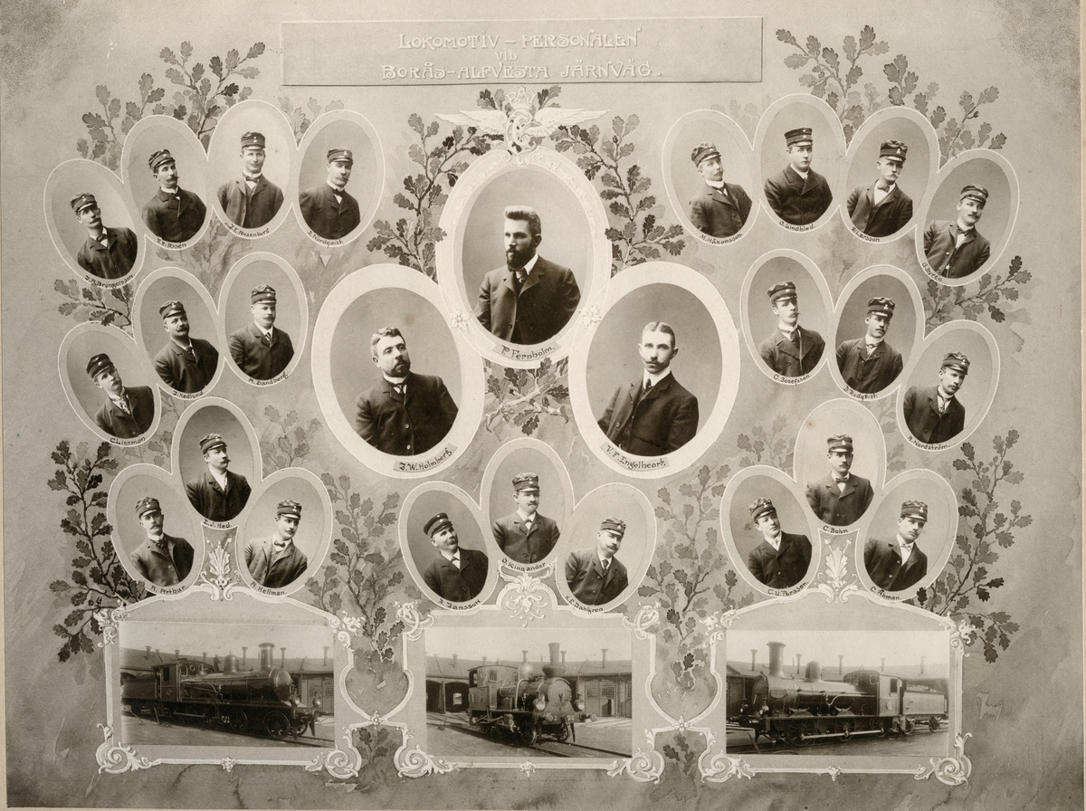 Porträtt av lokomotivpersonalen och 3 ånglok vid Borås - Alvesta Järnväg, BAJ lok 7, BAJ lok 22, BAJ lok 4.