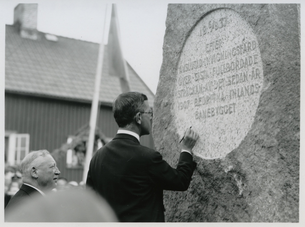 Kronprins Gustav Adolf inviger inlandsbanan med sin namnteckning på en minnessten