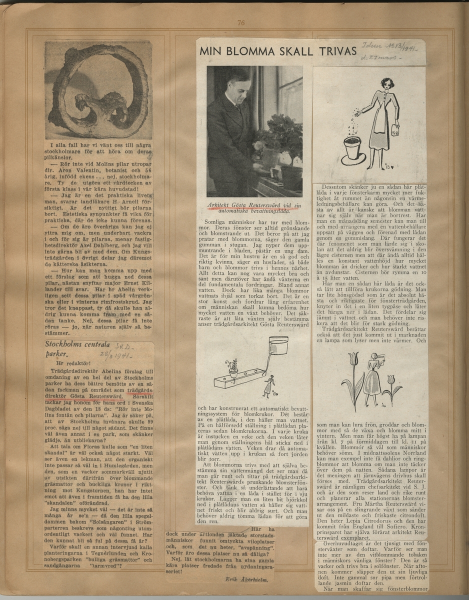 Tidningsklipp ur "Uppsatser om trädgårdar m.m. som på ett eller annat sätt beröra Gösta Reuterswärd 1931-1943".