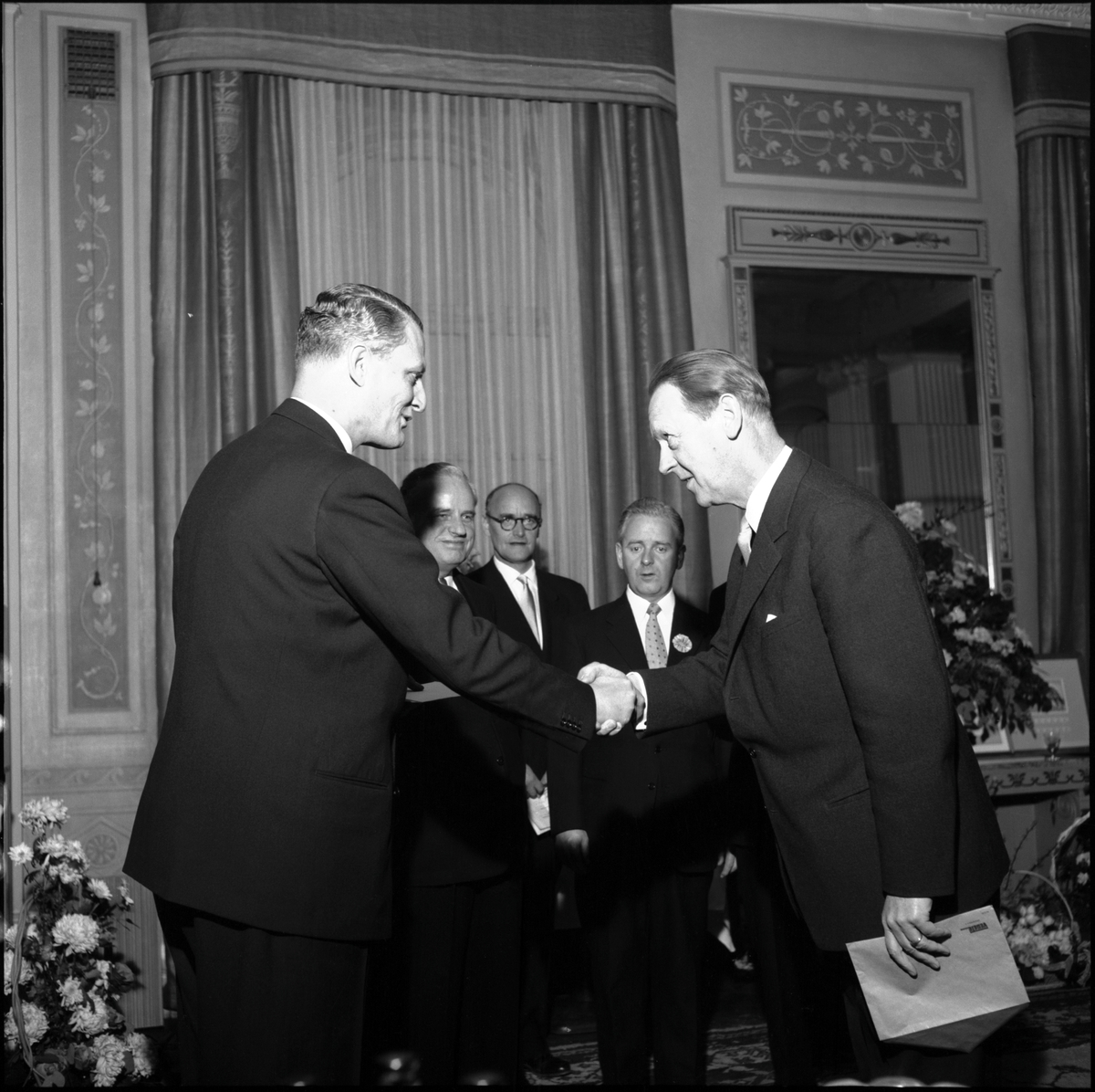 Generaldirektör Erik Upmark tar emot gåvor från Sydkraft, VEGETE-bolagen, SAL, Sv. Turisthot Riksförbund.