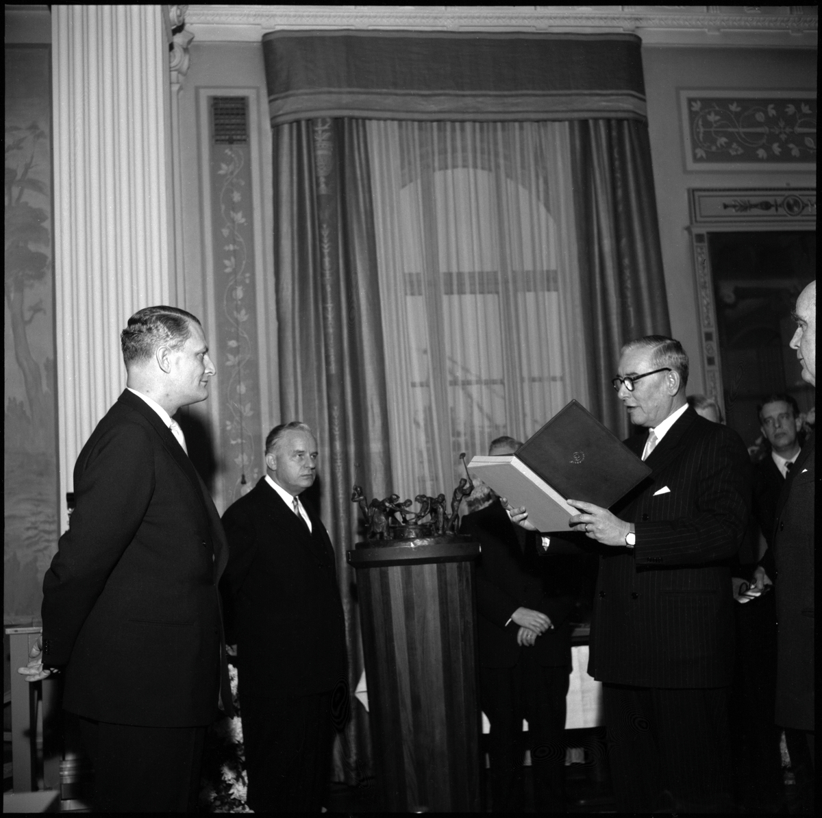 Generaldirektör Erik Upmark tar emot gåvor från Stockholms Saltsjöns järnvägar SSnJ, NOHAB, St. Kopparberg, Kockums, LME.