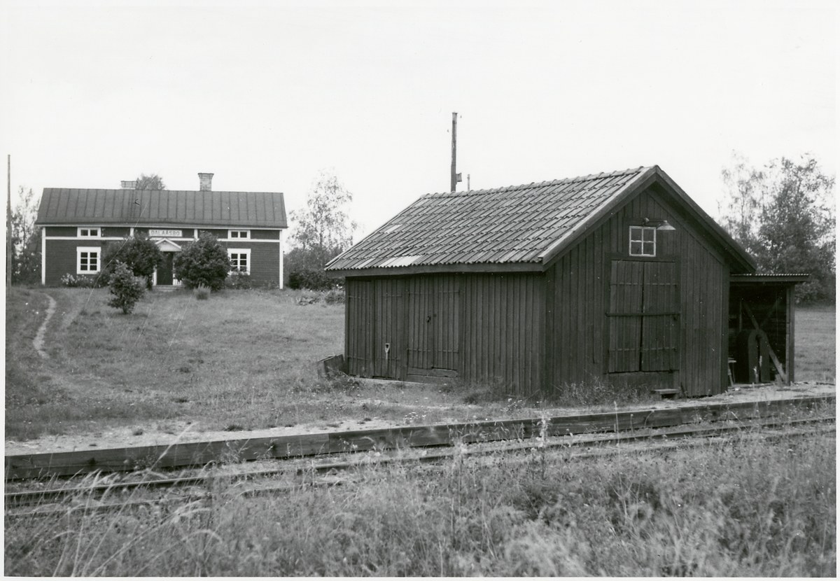Vy vid Dalaåsbo. Stationhuset byggt omkring 1896/1903 F.d. stationshuset ligger ca 50 meter från banan och är bevarat som privatbostad. Lastplatsens byggnader vid banan helt raserade, enbart betongplattformen återstår. Fundament till bommar vid väg 75 m SO