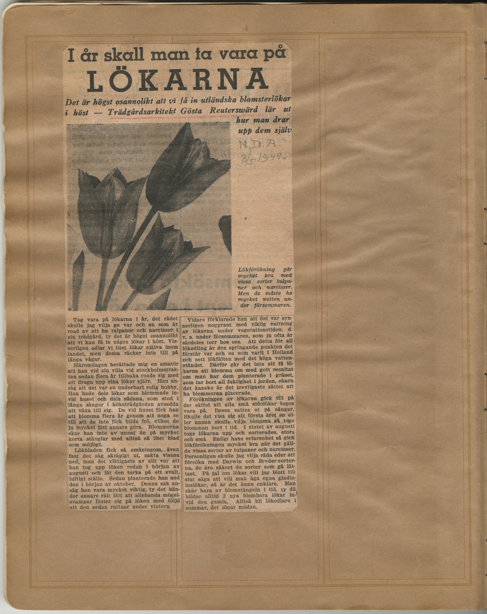 Tidningsklipp ur "Uppsatser om trädgårdar m.m. som på ett eller annat sätt beröra Gösta Reuterswärd. Samlade av Ernst Hj."