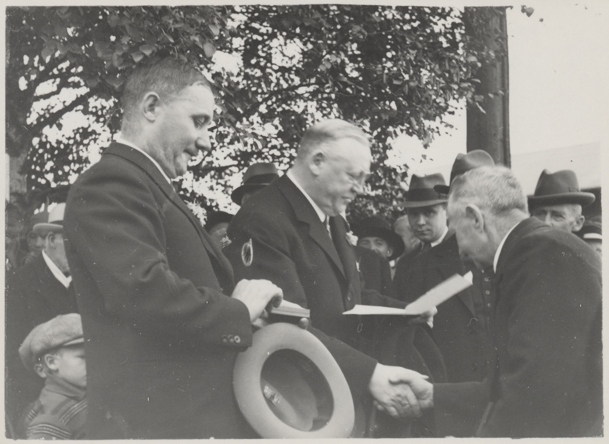 Arbetaren J.V. Svensson tar emot medalj. Utdelningen skedde i samband med invigningen av Statsbanan Malung-Vansbro vid Malungs Station. Till vänster i bild ser vi Stadsrådet Kommunikationsminister Henning Leo och i mitten Generaldirektören för Statens Järnvägar Axel Granholm.