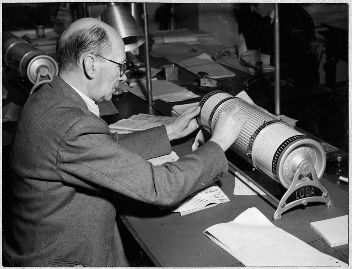 Kontrollör Oskar Ask vid sin "Loga" Calculator (räknemaskin).