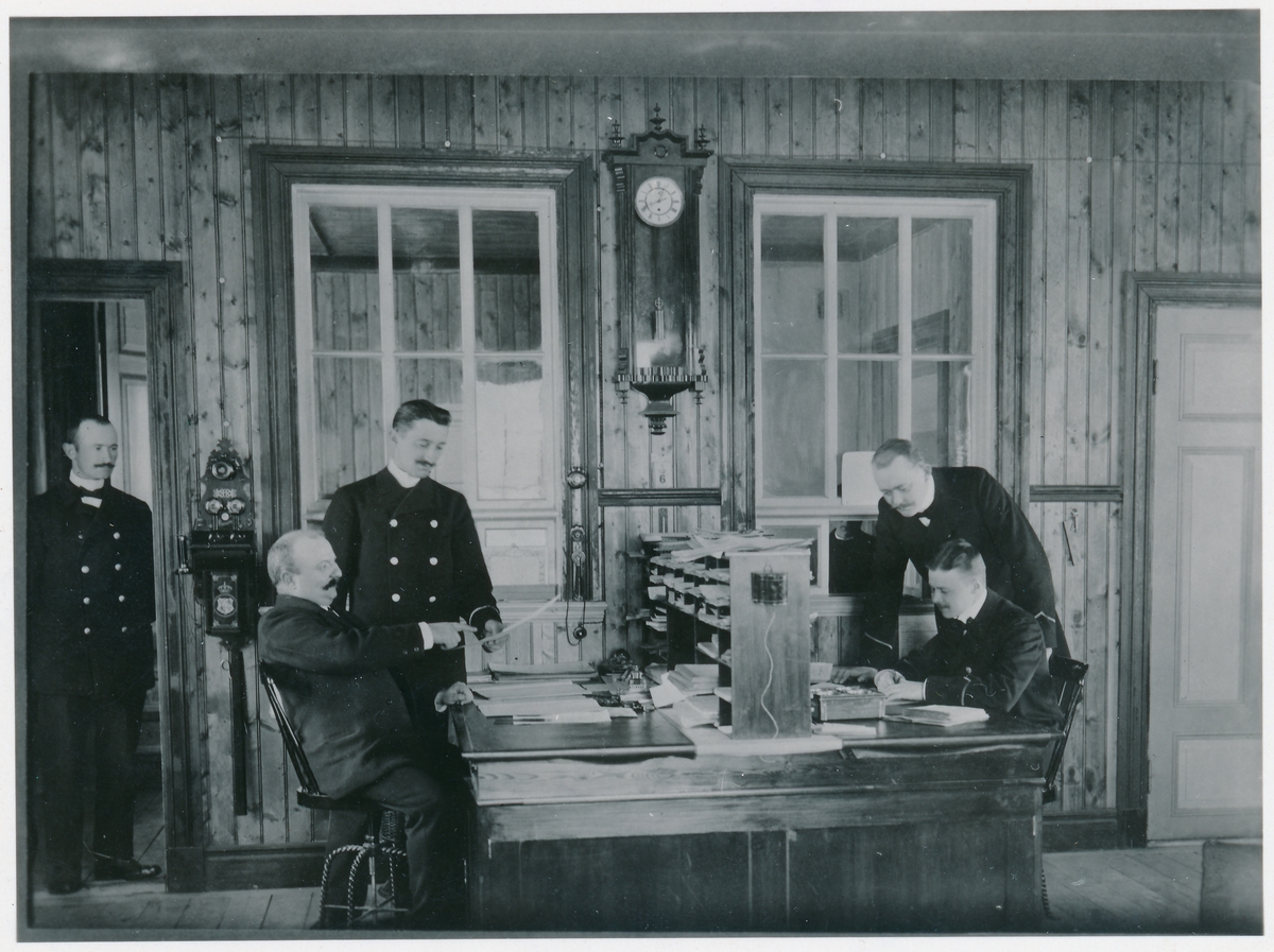 Fraktgodsexpedition i Ljusdal , Stationskarl? oläsligt namn,(i dörren) Förste stationsskrivare Huga Sandberg född 1859 (sedemera stins i Bispgården ö. Näsviken), kontorsbiträde Carl Gusaf Kling född 1842, Stationsskrivare Einar Blomen(sitt andra) Stationsskrivare Olof Samuel Rogberg född 1877sedemera förste stationsskrivare i Söderhamn, utanför omkom en trafikant 1919