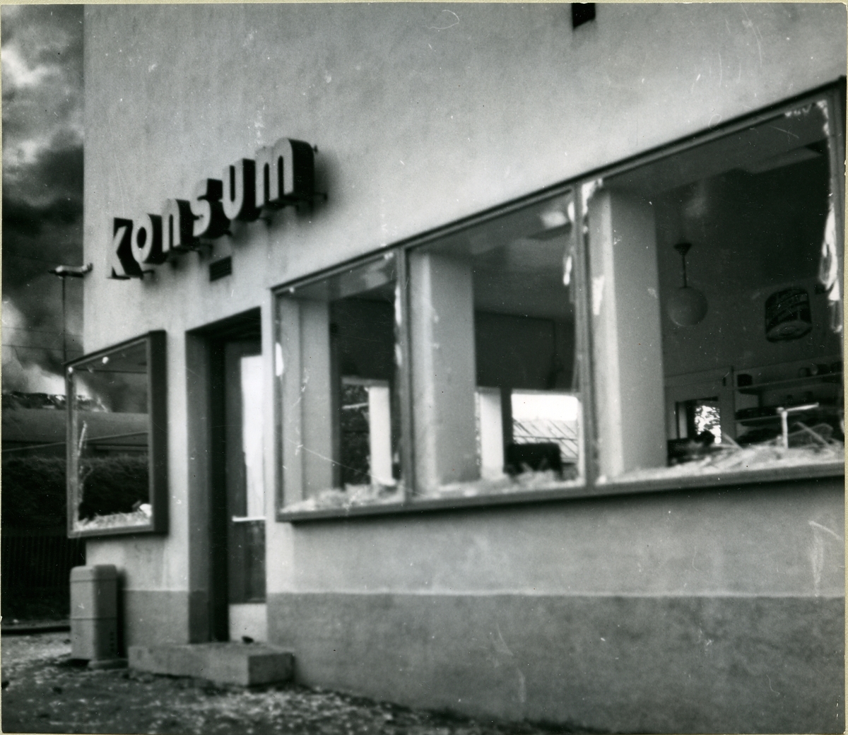 Krylbo-olyckan. Affärens fönster urblåsta av tryckvågen. I bakgrunden täcks himlen av brandrök.
