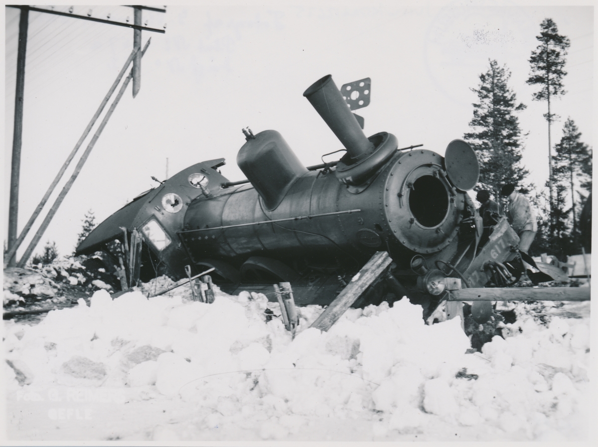 Titel: Olycka med flyktingtåget nr: 3043 med Statens järnvägars ånglok SJ Cc 617, som körde på tåg nr: 1613 vid Röstbo. Den 6 februari 1916.
