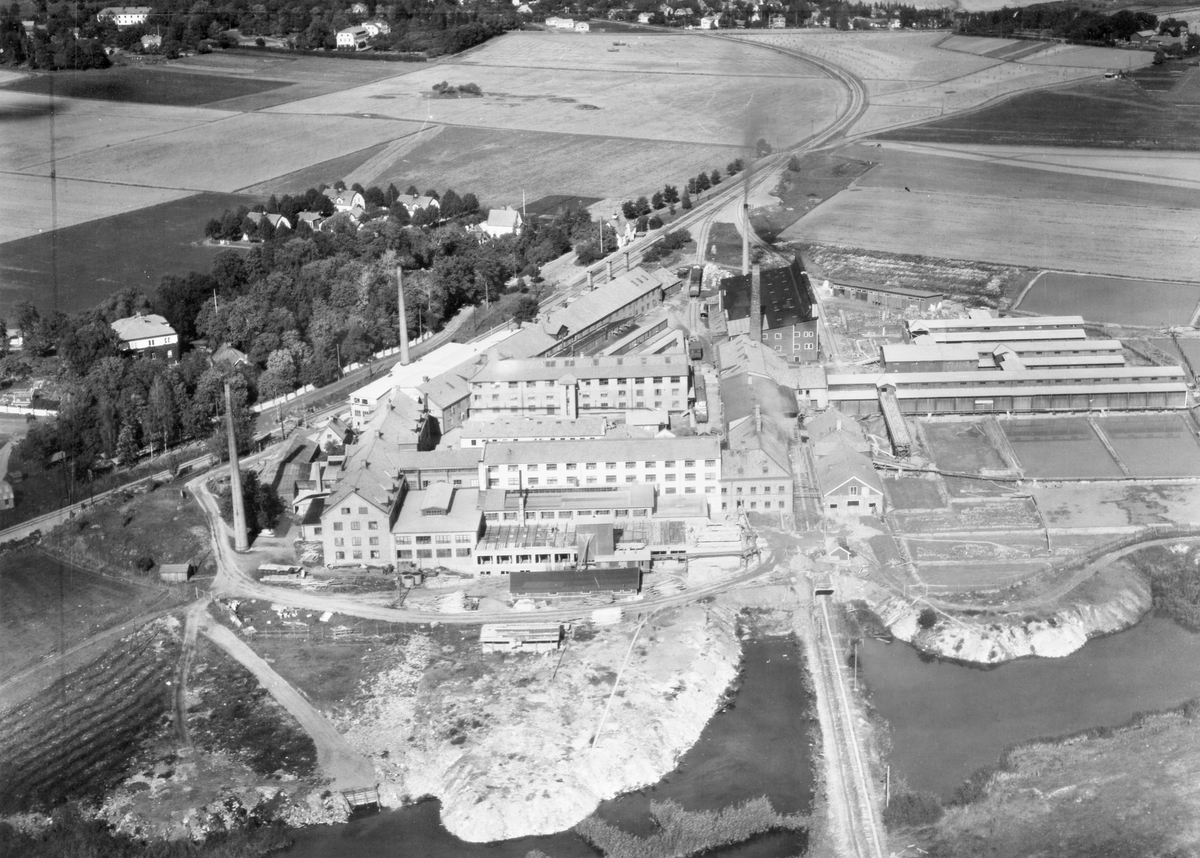 Flygvy över Ekebybruk tegelfabrik och järnvägsstation.