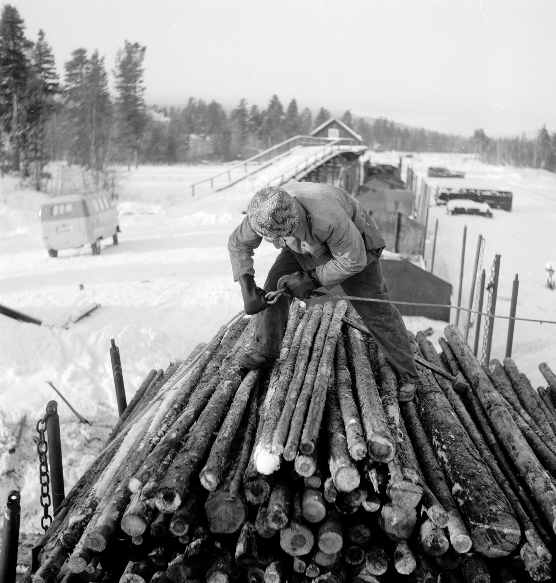 Titel: Lastning av timmer från lastbil till godsvagn med Puller timmerlastningsapparat, Glissjöberg.