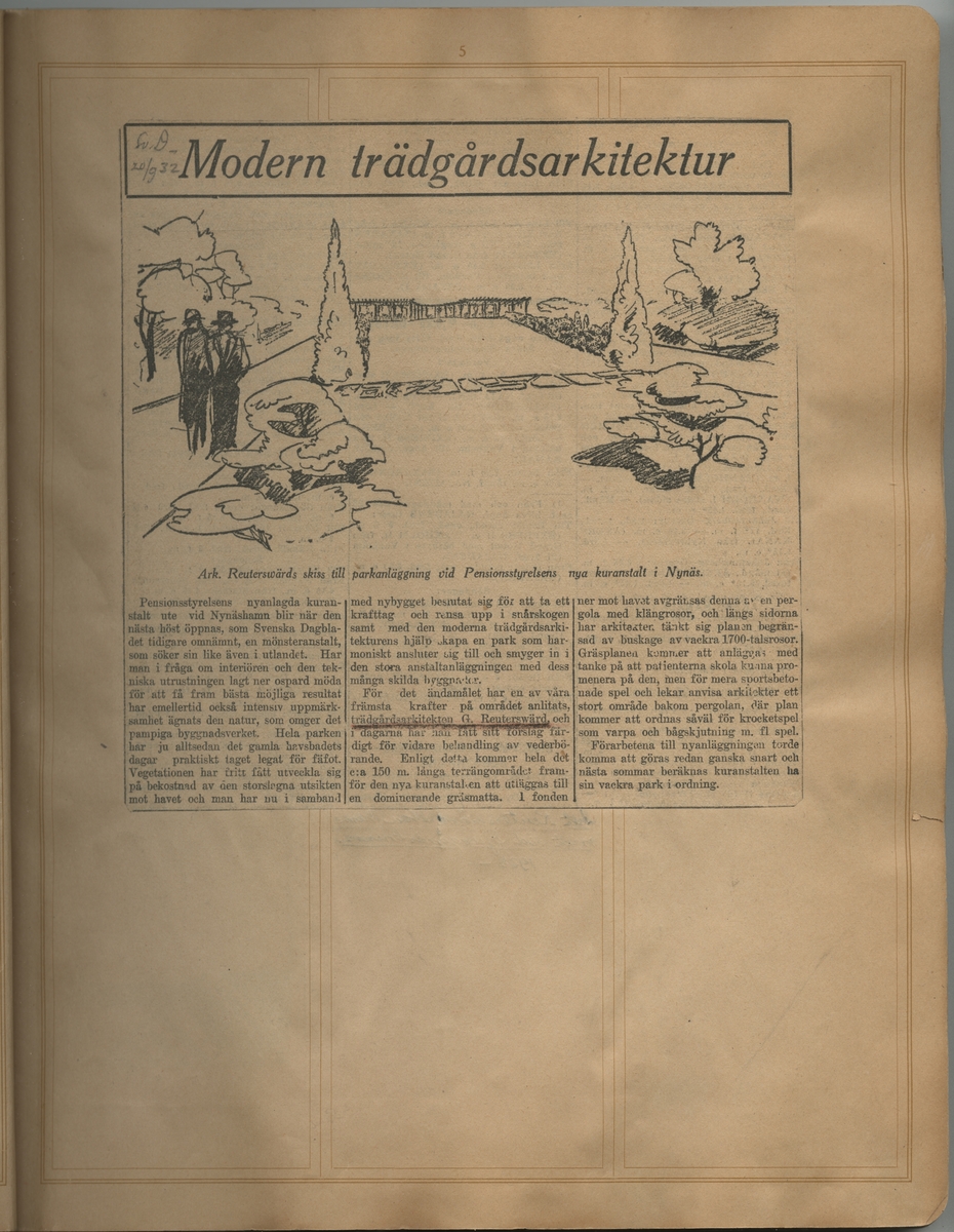 Tidningsklipp ur "Uppsatser om trädgårdar m.m. som på ett eller annat sätt beröra Gösta Reuterswärd 1931-1943".