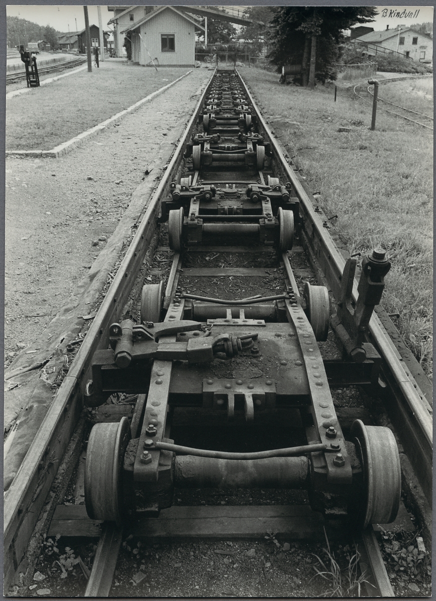 Överföringsgropen med trallor, till höger industrispår, till vänster tågspår, manskapsrum och magasin vid smalspår på Åtvidabergs stationsområde.