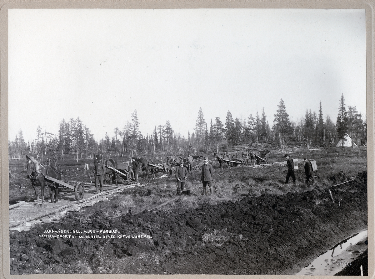 Förste baningenjör Axel Poring (med hunden) arbetsledare för första arbetssträckan från Gällivare vid järnvägsbyggnaden Gällivare-Porjus.