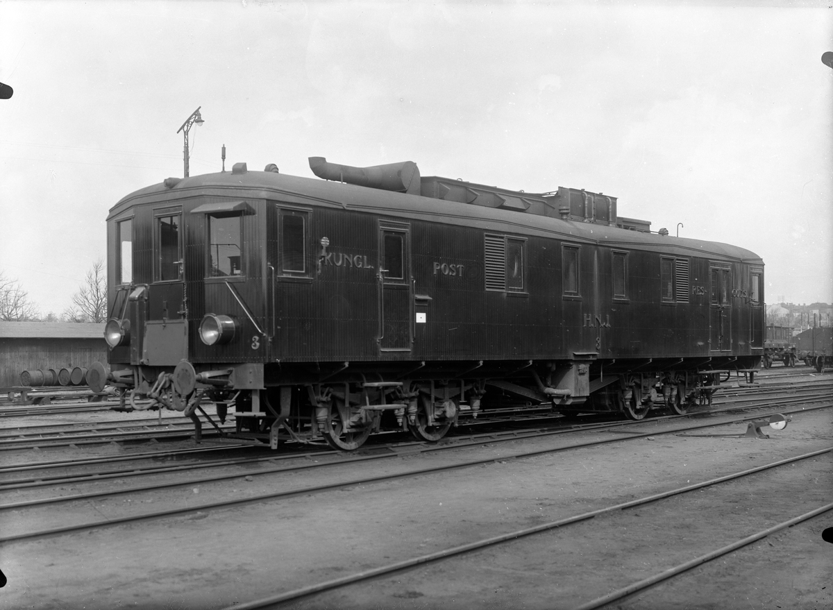 Motorvagn HNJ X1 3 tillhörandes Halmstad-Nässjö Järnväg. Vagnen byggdes av Dieselelektriska vagnaktiebolaget (DEVA) 1921 och byggdes 1937 om till kombinerad post- & resgodsvagn. HNJ förstatligades 1945.