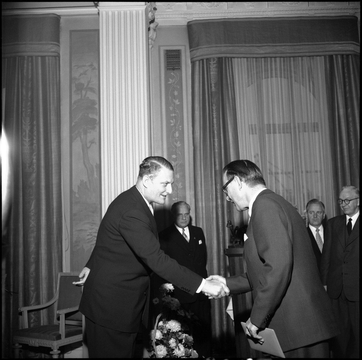 Generaldirektör Erik Upmark tar emot gåvor från Stockholms Saltsjöns järnvägar SSnJ, NOHAB, St. Kopparberg, Kockums, LME.