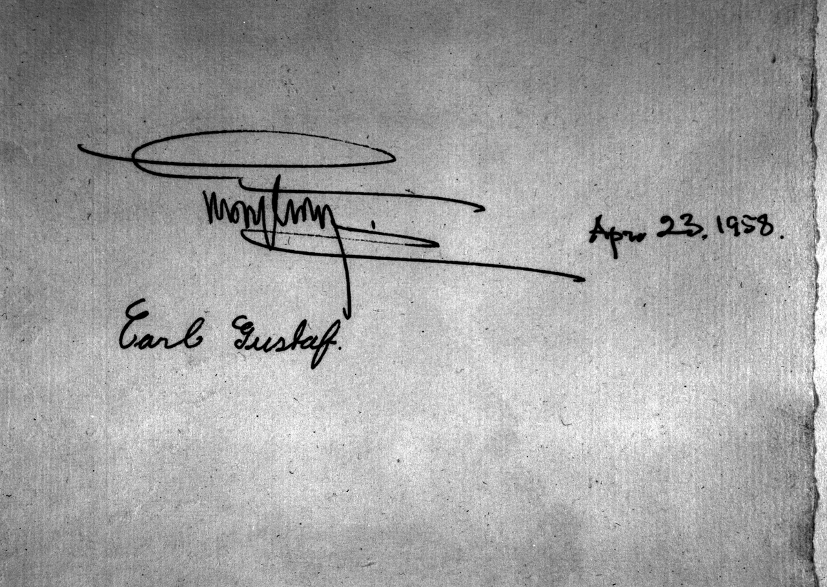 M/S Trelleborg. Kungliga namnteckningar i gästboken. Gustav Adolf och Carl Gustaf, 23 april 1958