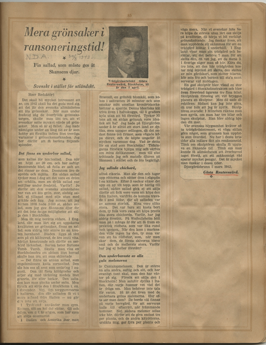 Tidningsklipp ur "Uppsatser om trädgårdar m.m. som på ett eller annat sätt beröra Gösta Reuterswärd 1931-1943".
