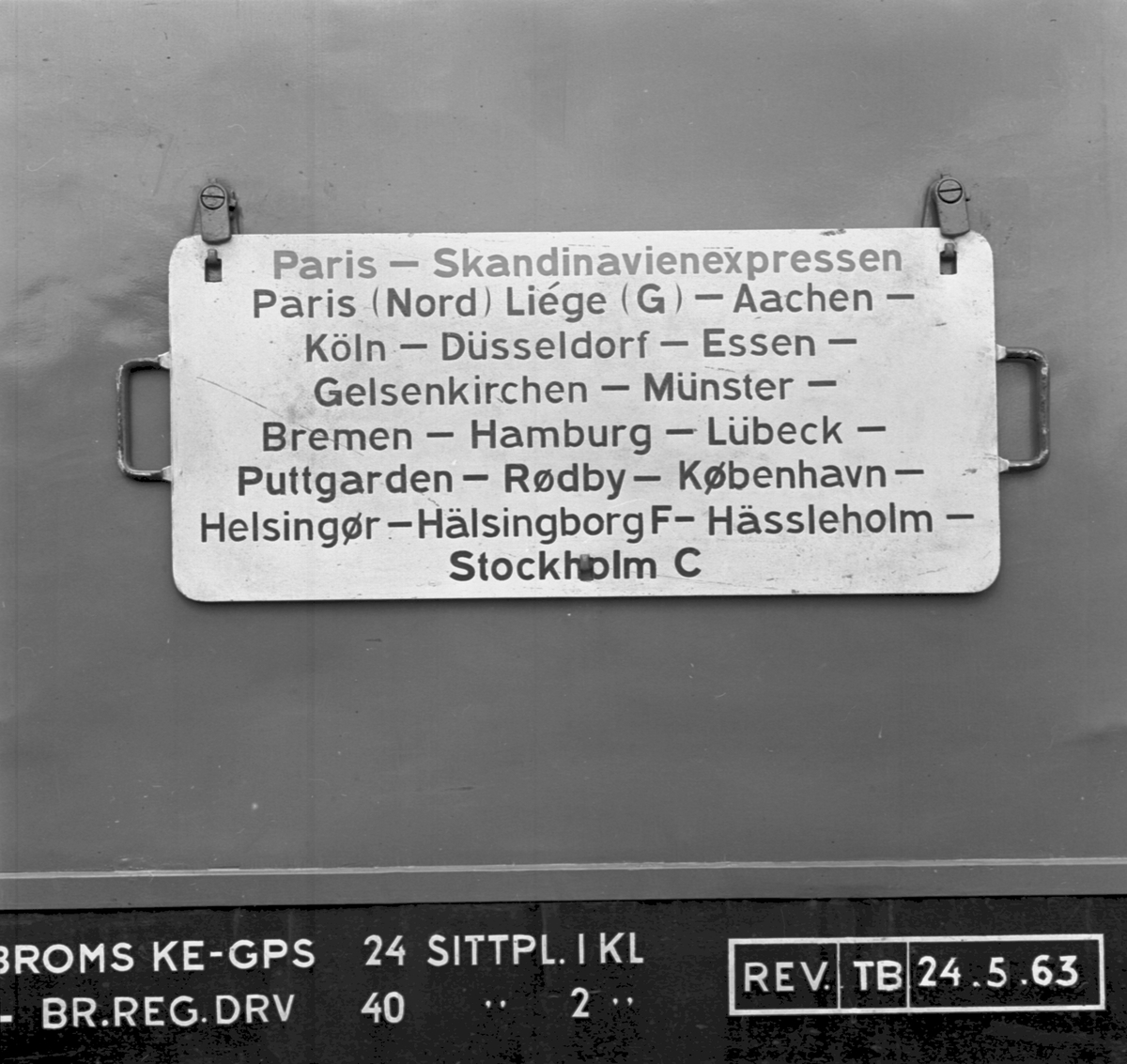Statens Järnvägar, SJ ABo24. Vagnskylt, Paris - Stockholm Central
