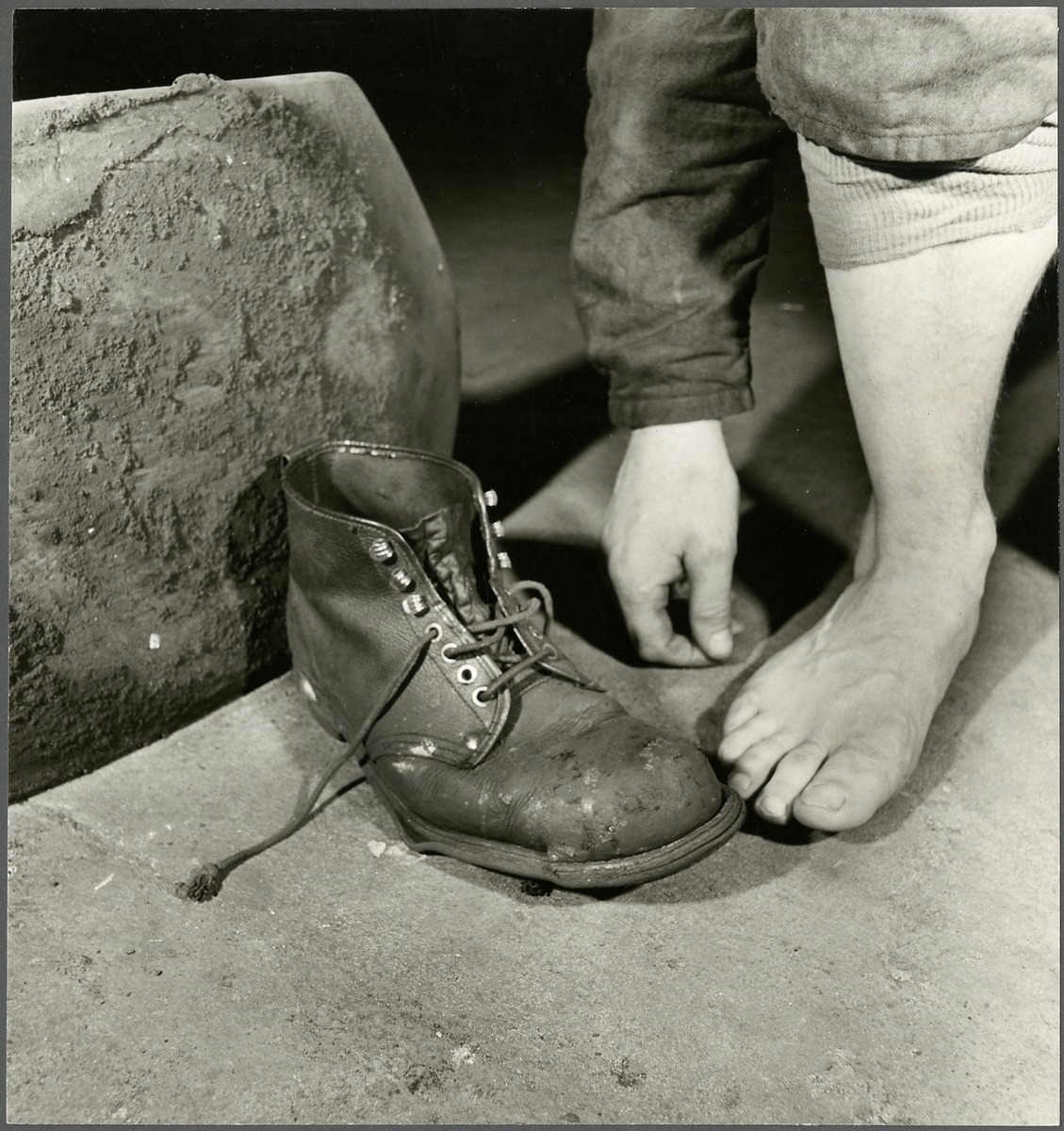 Personvagnsreparatör Einar Larsson, vid Trafikaktiebolaget GrängesbergOxelösunds Järnvägars järnvägsverkstad i Eskilstuna, demonstrerar hur skyddsskon räddade hans tår i samband med en arbetsplatsolycka då en 150 kilos buffert föll ner på hans fot.
