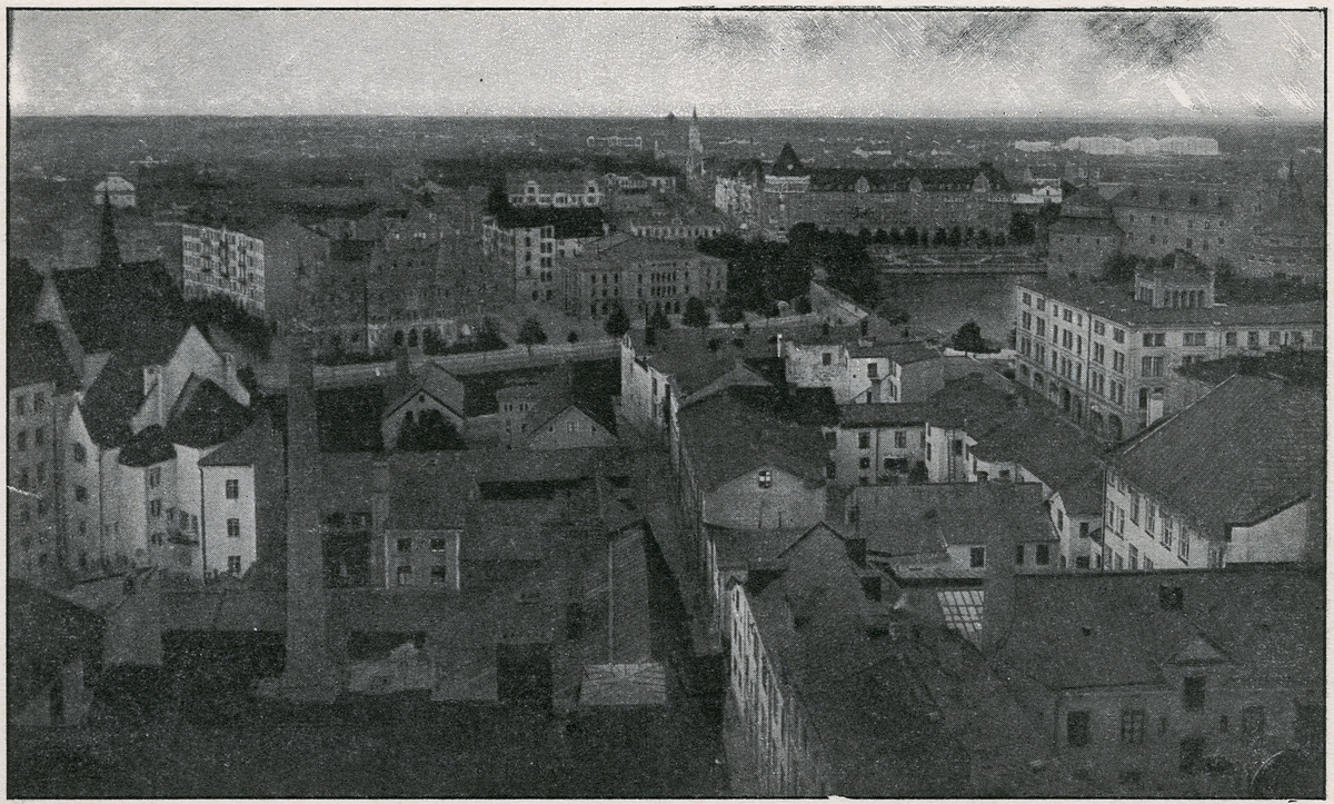 Örebro, utsikt över Örebro norrut från Nikolaikyrkans torn med slottet till höger och teatern i mitten bilden.