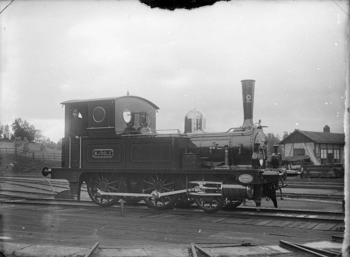 NOJ lok 12. Ånglok på vändskiva. Fick namnet Sjögle. Loket tillverkades av Motala Verkstad. Bilden är troligen tagen vid leveransen. Loket finns som museilok i Älhult.