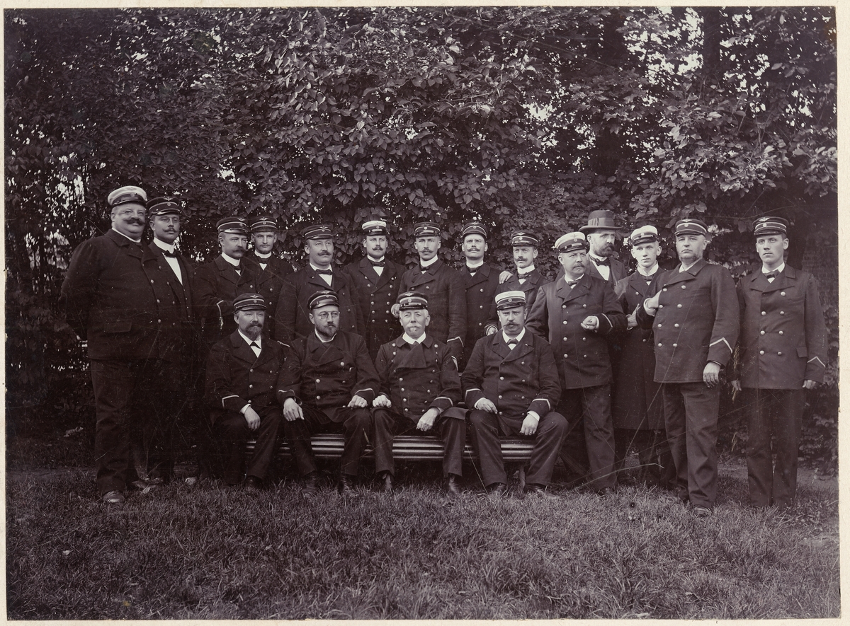 Stående från vänster: Stins Cederström, sts Walden, Englund, Cederberg, Öhrstrand, Vestman, Pedersén, Bergvall, Liljedal, fsts Camitz, Tliö Davidson (civil) ex.sts. Ravn, fsts. Graveleij, tlt Skarstedt.