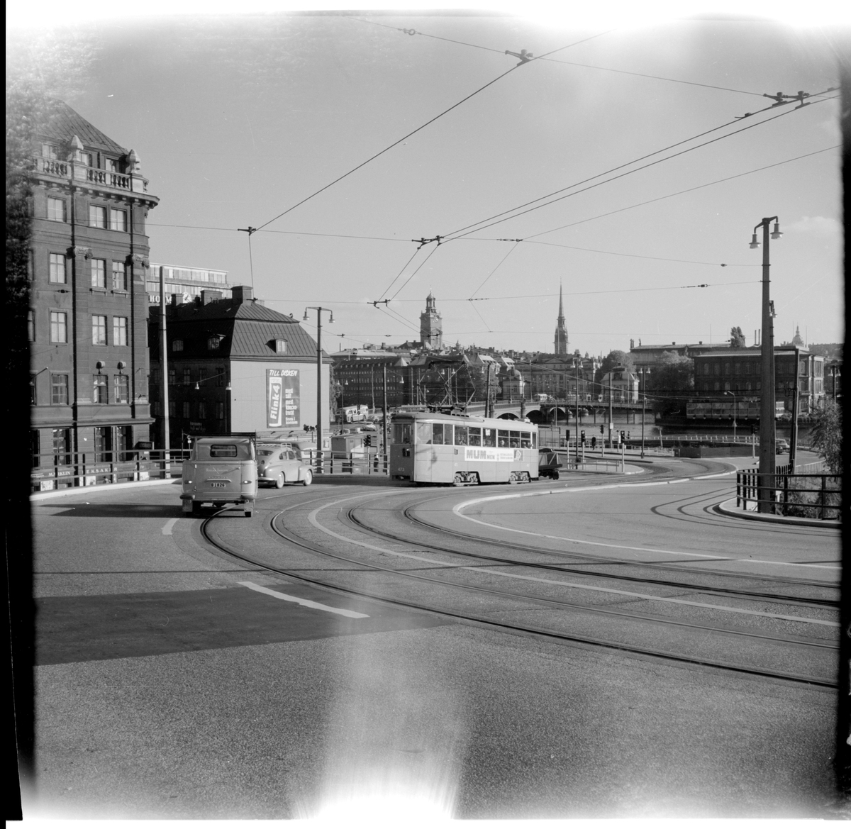 Aktiebolaget Stockholms Spårvägar, SS A26 473 "mustang" linje 1 Norrmalmstorg - Rosenlund på nedfarten mot Tegelbacken från viadukten över Statens Järnvägar, SJ.