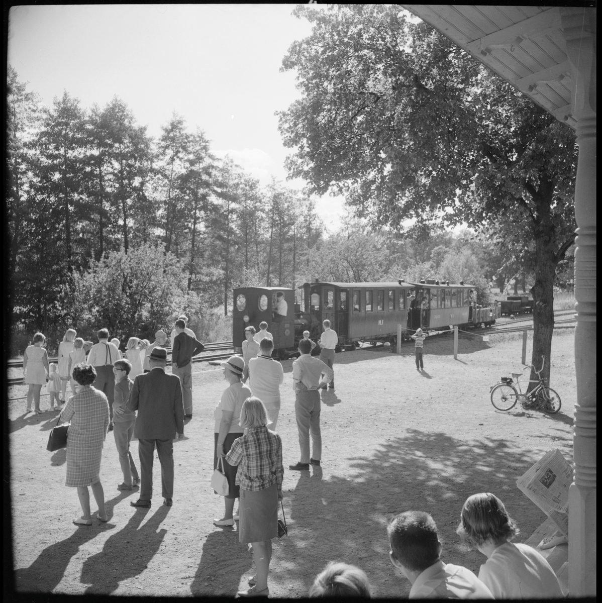 Resande vid Östra Södermanlands - Järnväg, ÖSlJ lok 2 "Lotta", Munkedals Järnväg, MJ 1:a klass vagn och Jönköping - Gripenbergs Järnväg, JGJ 3:e klass vagn på stationen i Mariefred.