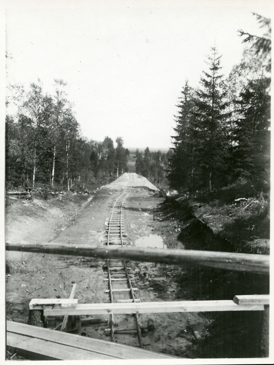 Bank vid Torhult på Borås-Jönköpings Järnväg. Decauvillespår, de färdiga rälsbitarna användes som provisoriska banor för banarbetsfordon.