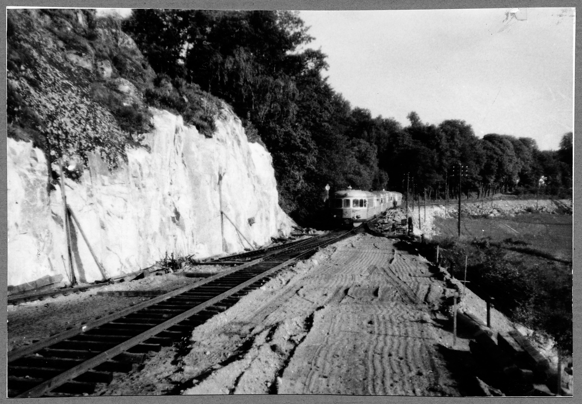 Första persontåg på normalspår, från Linköping anländer till Överums station. Ombyggnaden av den smalspåriga järnvägen mellan Åtvidaberg och Västervik till normalspår blev klar 1964.