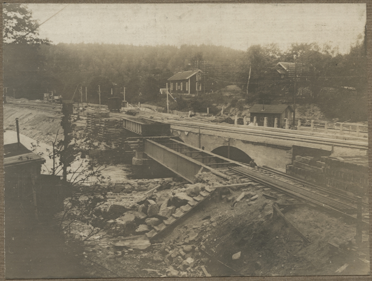 Dubbelspårsbanbyggnad Göteborg - Alingsås. Halva bron är färdig för trafik och den provisoriska bron demonteras bort. Norsesund år 1916.