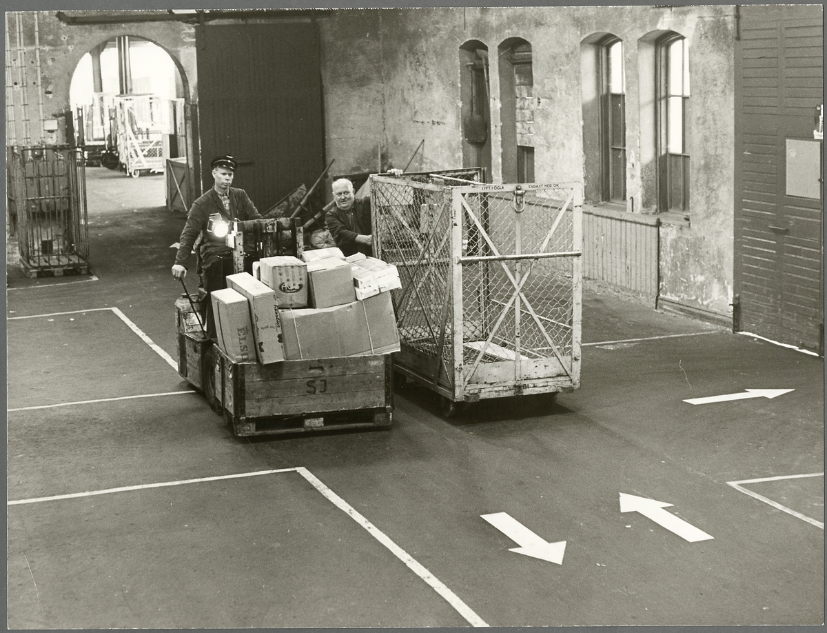 Trafikaktiebolaget GrängesbergOxelösunds Järnvägars fraktgodsmagasin i Eskilstuna. Trafikbiträde Lars Ek till vänster på trucken, och stationsförman Ville Pettersson till höger.