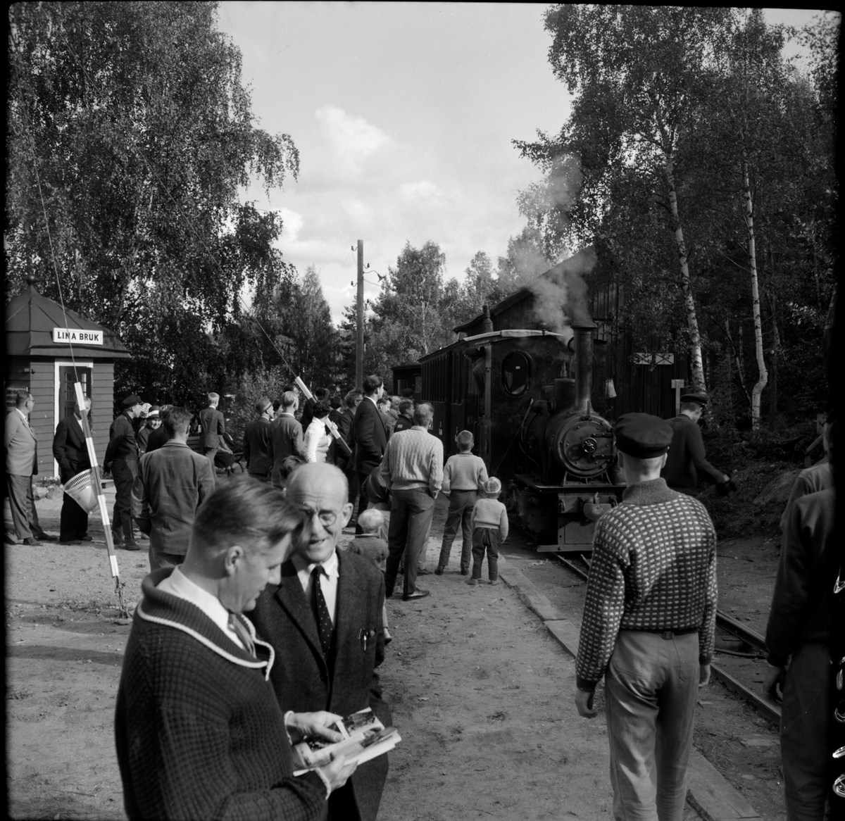 Museijärnvägen Östra Södermanlands Järnväg, ÖSlJ. Resande till ÖSlJ lok 2 "Lotta" och Kosta - Lessebo Järnväg, KLJ personvagn på Lina-banan vid Lina Tegel Bruk.