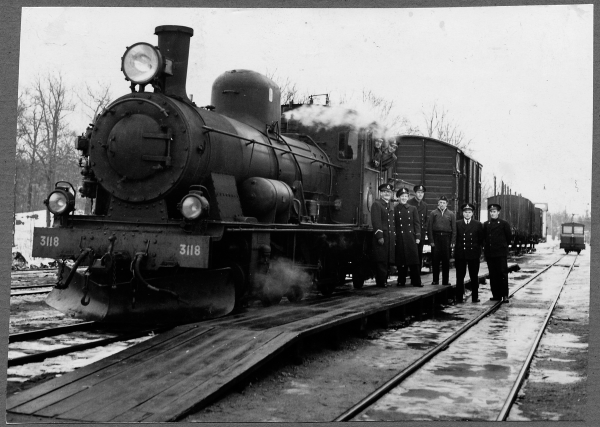 Del av bangårdsområde i Ankarsrum. Ånglok, Statens Järnvägar, SJ Gp 3118. Loket är före detta Västergötland - Göteborgs Järnvägar, VGJ lok 21, tillverkat av motala Verkstad 1916 för spårvidd 891. Det skrotades 1965.