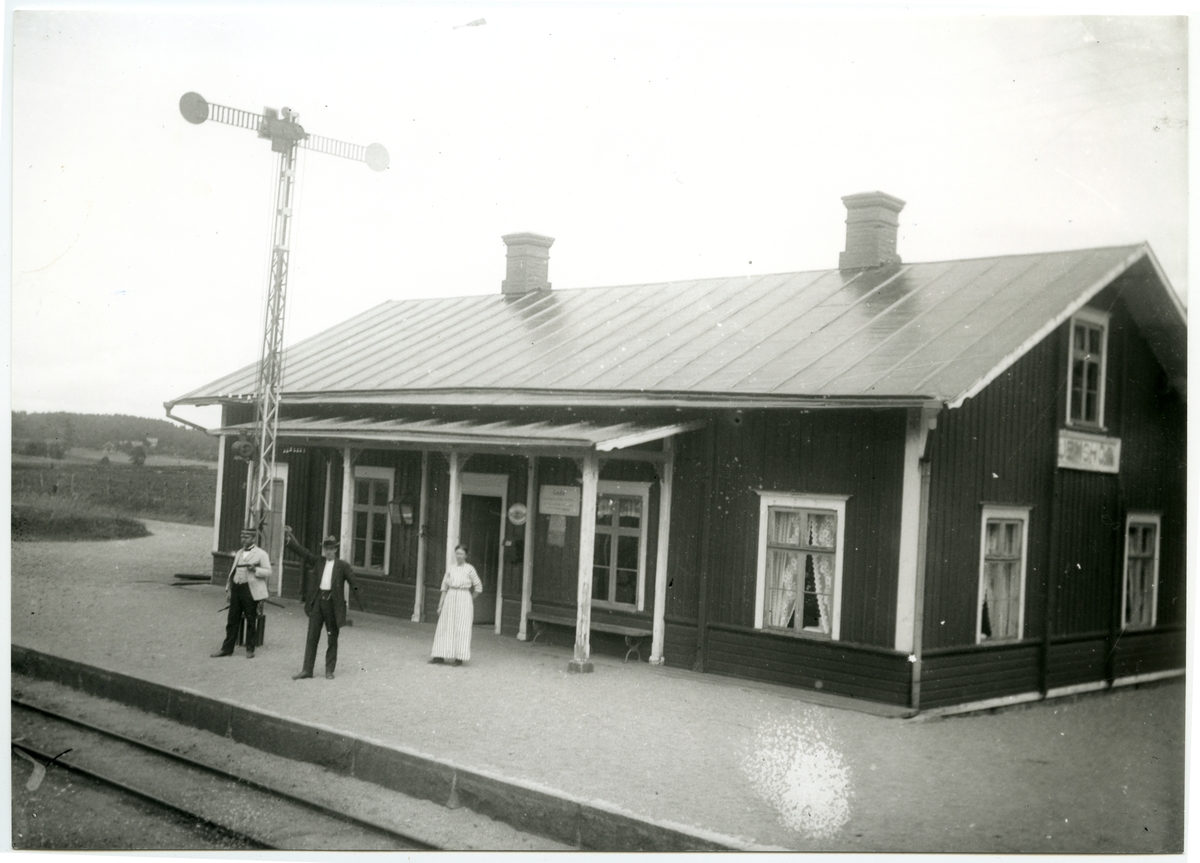 Jämshög station. Hållplats anlagd 1886. Station utmed den så kallade Holjebanan, från Holje till Sandbäck. Semaforen på plattformen har så kallade gallerverksvingar.