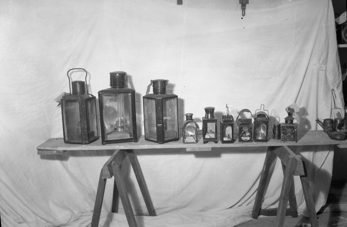 Div lyktor; Järnvägsmuseet. Rörelselykta för lok med invändig rörelse mod 1890-tal Ark nr 1316 Rörelselykta för lok med invändig rörelse mod 1860-tal Ark nr 1314 Rörelselykta för lok med invändig rörelse mod 1920-tal Ark nr 1317 Glasrörslykta mod 1910-tal Ark nr 1322 Glasrörslykta och signallykta, kombinerad Ark nr 1323 Manometerlykta mod 1860-tal Ark nr 1320 Manometerlykta mod 1870-tal Ark nr 2109 Manometerlykta mod 1910-tal Ark nr 1321 Tändarelykta Ark nr 2011