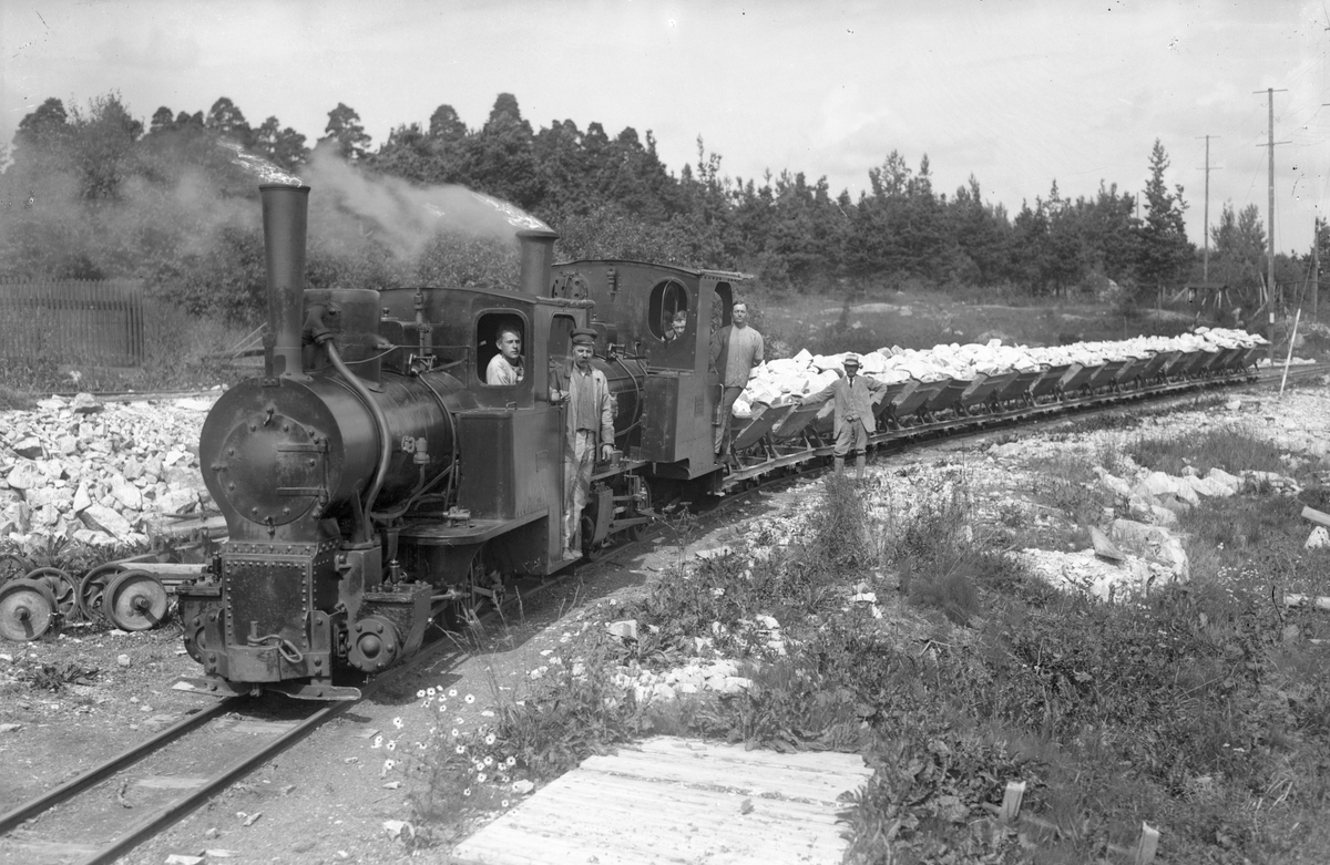 Titel: Ånglok från Strå kalkbruk. Kalkbruket hade en egen lastplats vid Sala-Gysinge-Gävle Järnväg, Kalkbacken, som var förbundet med bruket via ett industrispår.